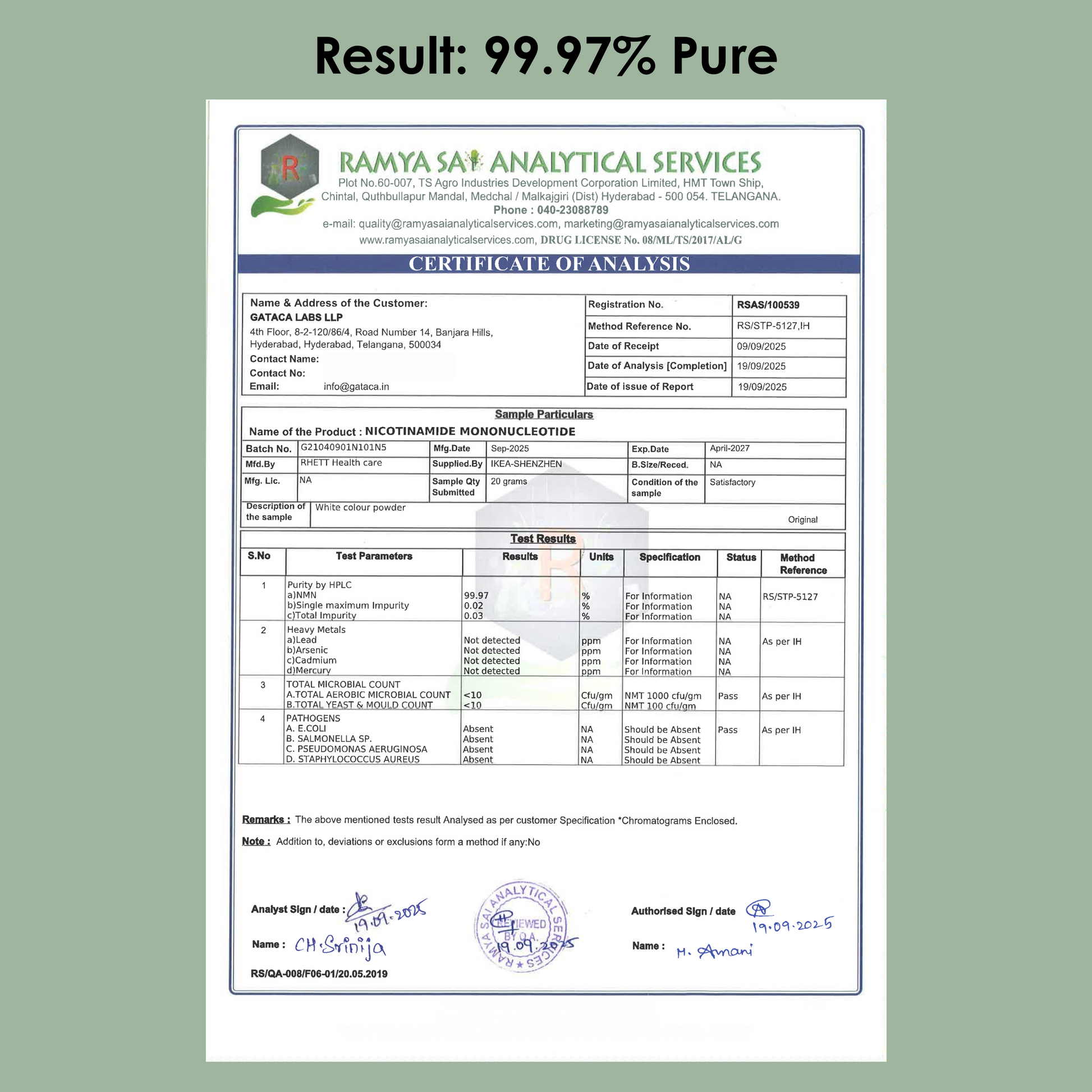 NMN is costly due to the complexity of its synthesis, stability requirements, and the purity needed for supplements to be effective and safe. Premium-grade NMN involves rigorous manufacturing standards. Our NMN is backed by 21 patents and tested for purity, microbes & heavy metals.